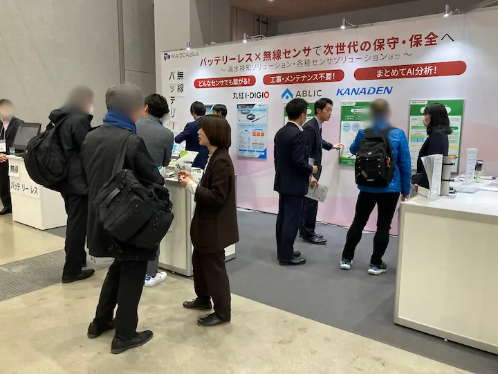 当グループの出展ブースでは、エイブリック株式会社、株式会社カナデンと共同で統合IoTプラットフォーム「MAIDOA plus」を活用した漏水検知ソリューションを中心に、BEMS(ビルエネルギー管理システム)や高齢者見守りサービスなど各種センサソリューションを展示しました。