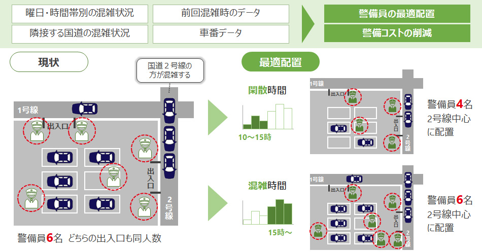 - 混雑に合わせた計画的な警備員の最適配置と警備費コストの削減