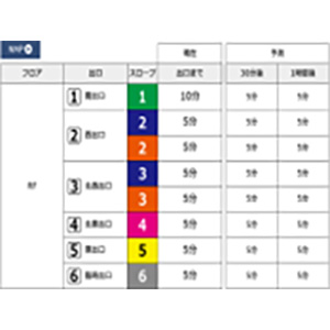駐車しているフロアから各出口までのルート別に渋滞予測時間を表示することで、退出に最適なルートが把握できるようにしました。また、フロア別・ルート別に色を分け、わかりやすい表示にしました。