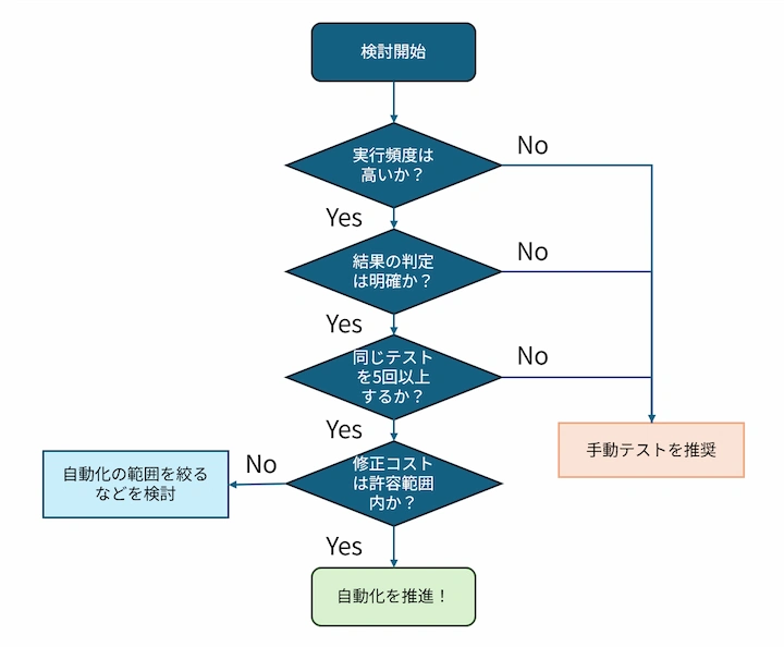 テスト自動化を始めるべきか、まだその時ではないのか。以下のフローで、あなたのテストの現在地を確認してみましょう。