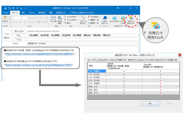 ※「共有リンク宛先チェック」ボタンを押すだけで、宛先のメールアドレス毎のアクセス権を表示するウインドウがポップアップします。(画像は開発中のものです) - Box共有リンクをメール本文に簡単ペースト