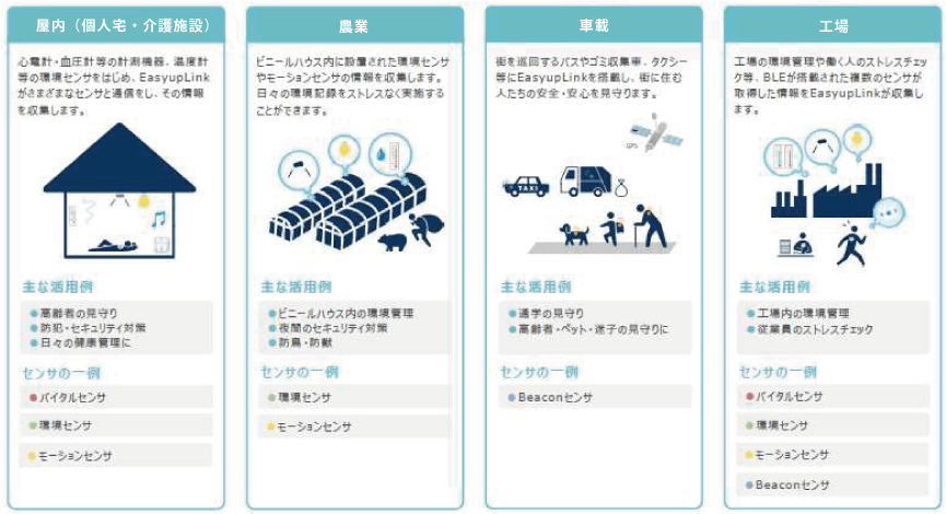 また、「EasyupLink」には、準天頂衛星(QZSS)対応のGPSチップを標準搭載しており、GPSトラッキングの用途にも対応可能です。その他、BLE 通信の親機として受信データを中継するIoTゲートウェイ機能に加え、子機としてBLE通信の発信側にも拡張可能であり、スマートフォンへのプッシュ通知など販促利用も可能となっております。
