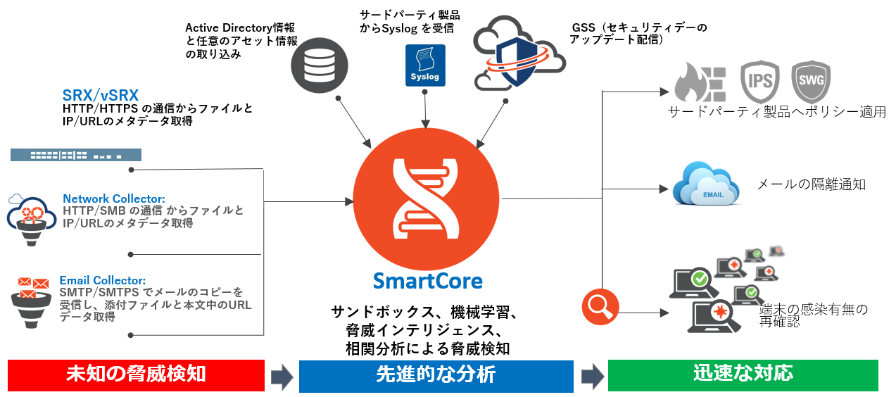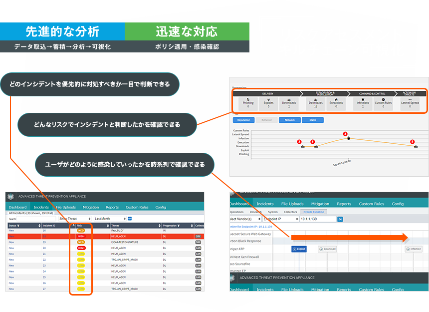主に、インターネットトラフィックやメールからの、既知および未知のマルウェアやC&Cサーバへの通信など悪意ある通信を、機械学習の機能を備えたサンドボックス(※1)で解析する機能、お客様が導入済みの様々なサードパーティ製セキュリティ製品から各種アラート情報を収集、攻撃の関連性を自動的に結びつけサイバーキルチェーン(※2)をGUI上で可視化し脅威のリスクを判別する機能により、企業のセキュリティ対策を強化します。