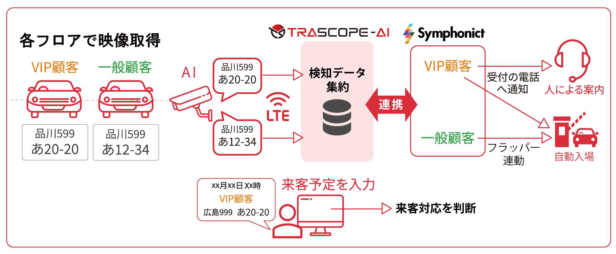NEC ネッツエスアイは、「TRASCOPE-AI」によって検知/解析した「車番」や「行動」などのデータと、同社のDXブランドである「Symphonict」のプラットフォームサービスでつながる各種クラウドサービスやお客様の既存システムと連携することで、来客の通知や案内の自動化などを行うことができ、ホスピタリティの向上や業務の効率化に貢献します。