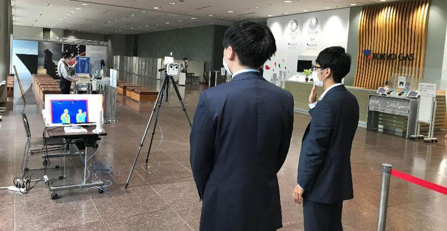 本ソリューションは、新型コロナウイルスの感染拡大防止に向けた水際対策として、サーマルカメラを使用し、非接触で対象者が発熱していないかどうかを検出します。今回導入した東京ガス本社ビルでは、従業員及び来館者の体温を入館前に測定するため、オフィス玄関および入館ゲート近辺に計3台のサーマルカメラを設置致しました。