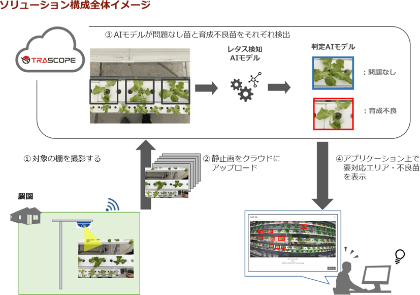 本システムでは、丸紅ネットワークが提供するAI分析映像監視サービス「TRASCOPE-AI」を用いており、レタス棚の静止画をクラウドにアップロードし、クラウド上でAI解析することにより、育成不良苗を検出します。検出結果は作業者へ通知します。