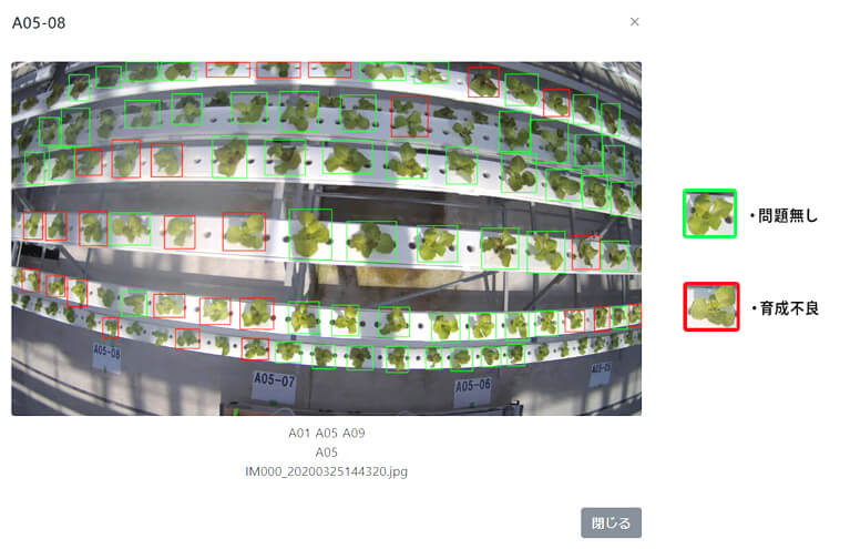 良苗・不良苗を学習したAIモデルにより、不良苗を漏れなく検知し、作業者へ通知が可能となりました。不良苗の発見後、早期に対応することで、生産効率を改善できます。本システムは第一弾として、羽生市レタス水耕栽培農園の運用モデルを基に開発されました。