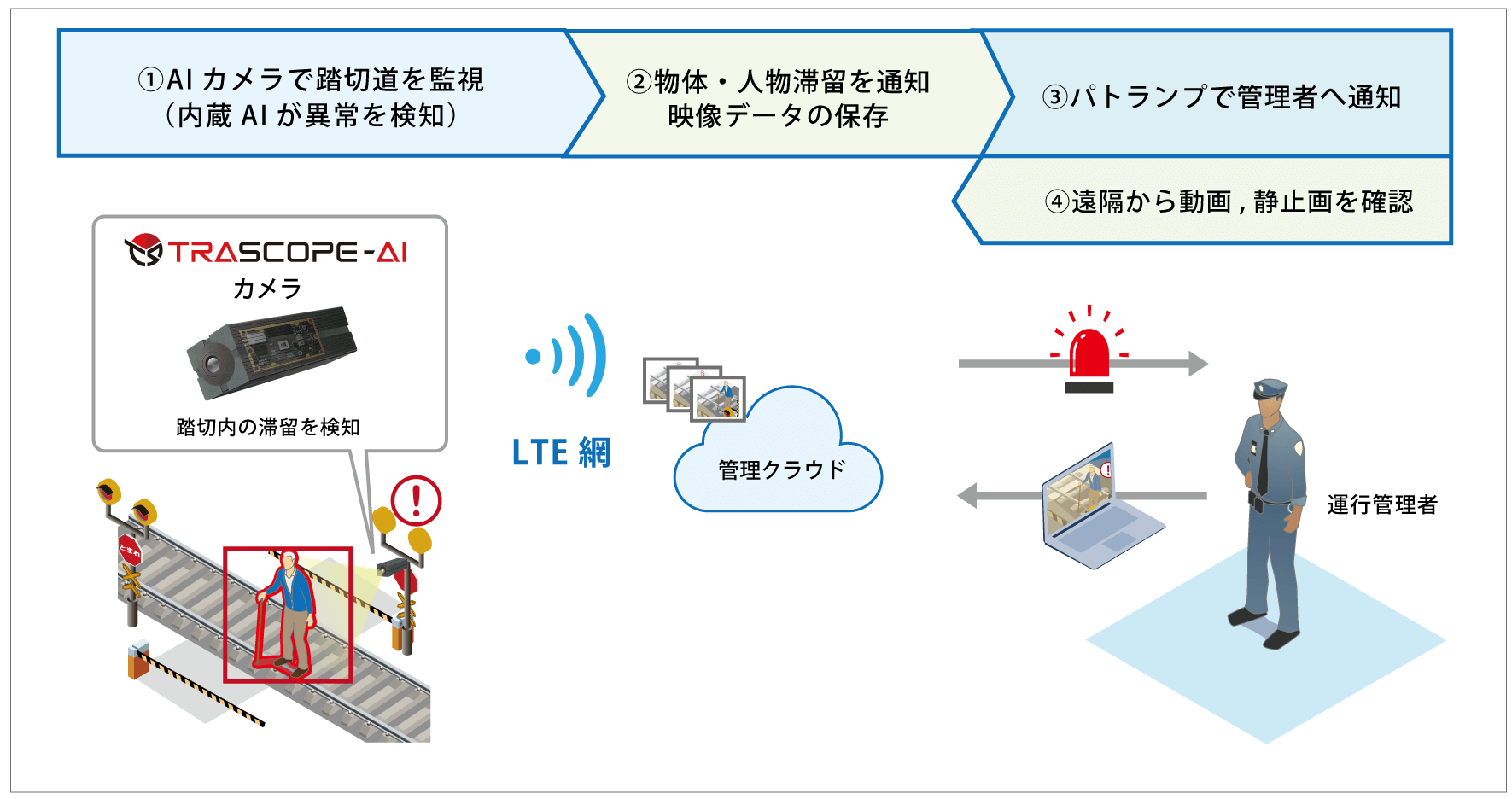 丸紅ネットワークソリューションズ株式会社(以下、「当社」)は、富士急行株式会社様(以下、「富士急行」)と協力し、2020年7月より富士急行線(大月~河口湖)にある第1種踏切道及び第4種踏切道(*1)にて、AI機能を搭載したカメラ(以下、「TRASCOPE-AIカメラ」)による滞留検知システム(以下、本システム)の実証実験を進めております。