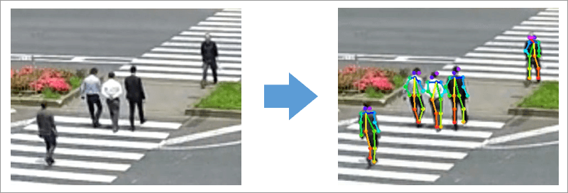 「骨格検知」は、これまで危険エリアへの人物の侵入検知で培ってきたAIアルゴリズムであり、踏切道での人物の滞留検知に応用しました。