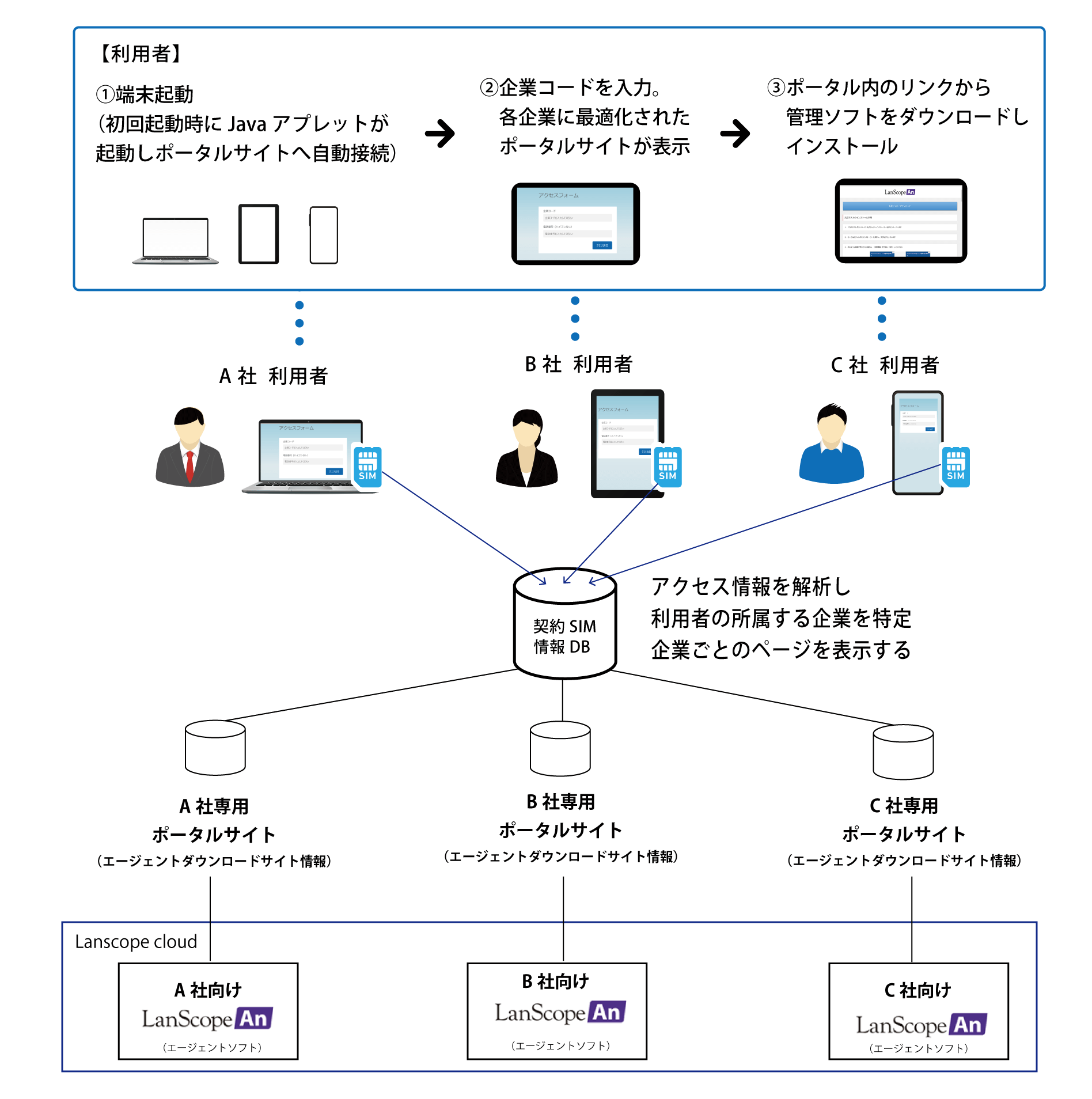 ポータルサイトは、MOTEXのLanscope Anクラウドと連携されており、本サービスを契約したお客様であれば企業毎に最適化されたエージェントソフト(※2)を容易にダウンロードできる仕組みとなっています。