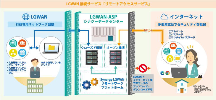 「リモートアクセスサービス」は、LGWAN環境にインターネット接続するためのJ-LIS(*)登録済みのリモートアクセスソリューションです。ユーザは自宅などからLGWANにインターネット経由でアクセスし、地方自治体の庁内にある端末に接続してリモート操作することができます。