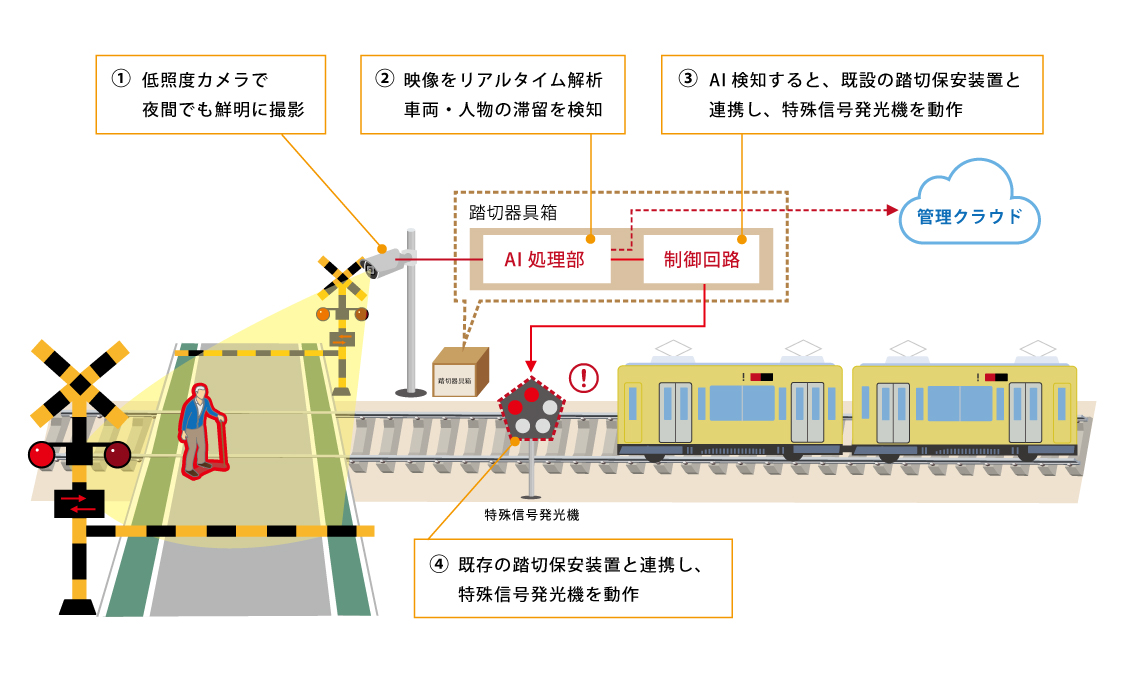 今回の導入試験では、西武鉄道の2か所の踏切に「踏切滞留AI監視システム」を設置し、その検知結果を現場の特殊信号発光機と連動させます。「踏切滞留AI監視システム」は、踏切内に滞留する自動車などの物体を検知するだけでなく、骨格検知により人の滞留も検知することができます。AI画像処理はエッジ(端末)側で行うため、「AIの目」がとらえた複数の画像をその場でリアルタイムに処理し、滞留を検知した際には現場の特殊信号発光機と直接連携して、通信網の状況の影響を受けることなく、列車の運転士に迅速に知らせることができます。映像カメラとしても利用できるため、カメラを追加設置することなく、司令所などの遠隔地からも現場の状況を確認することができます。