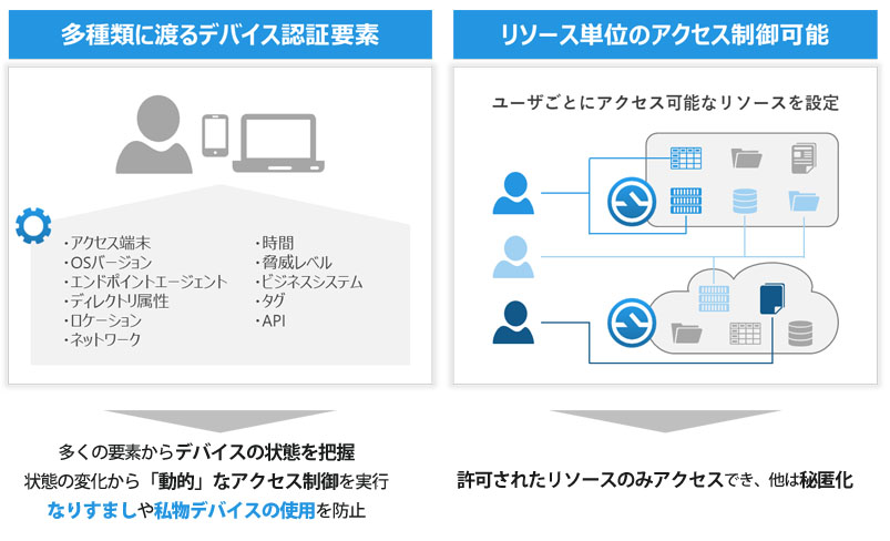 (2)多種類に渡るデバイス認証- 接続前の認証は、従来のID・Passwordによる認証だけでなく、端末のOSバージョンやロケーションなど多種類の要素を用いたデバイス認証が行われます。デバイス認証は接続後も5分ごとに実施され、設定変更等の変化があった際はその内容に応じてアクセス権の再設定を動的に行います。これにより、なりすましや私物デバイスの使用を防止することができます。