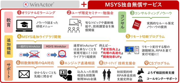 MSYSは、さまざまな業種、業界の現場でWinActorの導入から定着まで伴走する中、多種多様なお客様の悩みをお聞きしてきました。その経験から生まれた、WinActorを使い倒すにあたって“かゆいところに手が届く”仕組みとして、「独自無償サービス」を数多く展開しています。現場でのRPA定着と業務自動化・DX化促進の支援実績を積み重ねたことが評価され、8年連続のPartner of the year受賞に至りました。