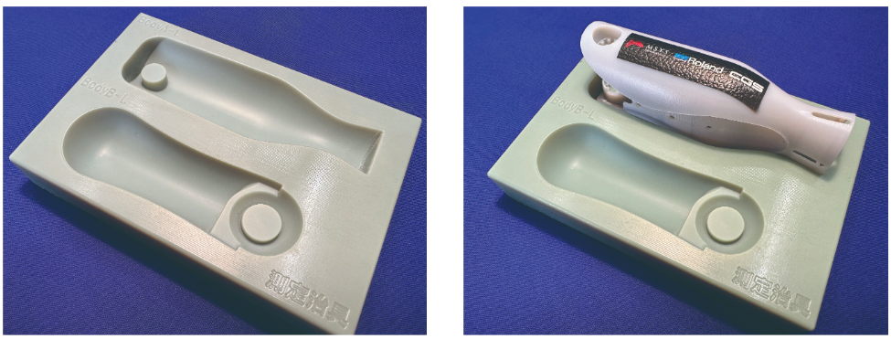 またUV印刷において、平面形状のモデルでなくとも、画像のように治具を作成する事でポイントに印刷をする事は可能になりますので、併せてご検討ください。