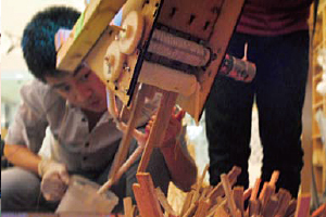 「小さい要素素材を積み上げて建築構造物を作ることを研究しています。実験しているのは、砂粒を自然に落としていくと重力や摩擦のバランスで砂山が積みあがる原理で、爪楊枝や割り箸をコンピュータ制御の機械で最適な位置に積み上げることで、建物の構造体を作ります。これを基にして、実際の建築物の大きさにしていくための素材や工法を求めていきます」