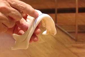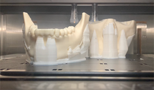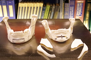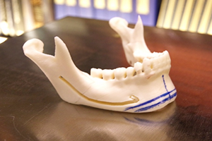 F120 3Dプリンターで造形した下顎模型。神経管まで再現されたモデルをもとに、手術方針をミリ単位で術前に検討することができる。