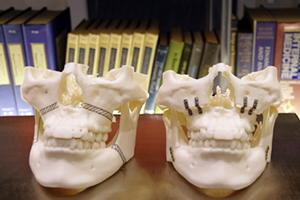 手術前(左)と手術後(右)を示す3Dプリント模型。顔面骨切り治療は、もたらす結果も大きいが故に高い技術が求められる施術方法であり、繊細な判断と技術が求められる。