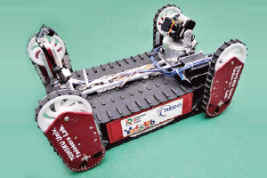 形は独特だ。戦車のように全身にクローラー(一般にキャタピラーと呼ばれる)を身にまとい、四つの角には手足のようなものが付いており、大きな段差があるときに四つの足を使って段差を 乗り越えるという設計だ。カメラによって周囲の状況を確認し、無線で遠隔操作をして動かしていく。