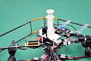 マニュアル操縦をせずに済むよう、米国カーネギーメロン大学の研究者らとともに、センシングによる自己位置推定などによって、自動で飛んで探索して戻ってくる自律性を獲得。さらに、電動式ヘリコプターに吸着機構を取り入れ、天井などに吸着して、そこからクモのように下にすーっと下がることで、プロペラ駆動なしで目的の場所に留まることができ、通常10分間しかない現場計測時間を30分に延ばすことに成功する。