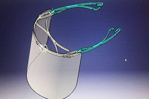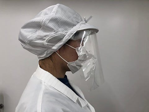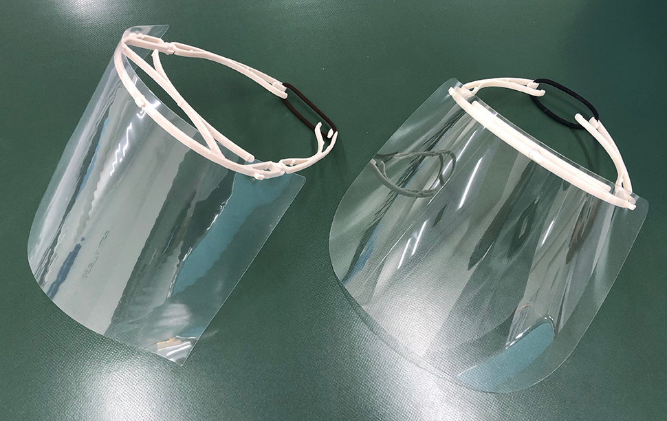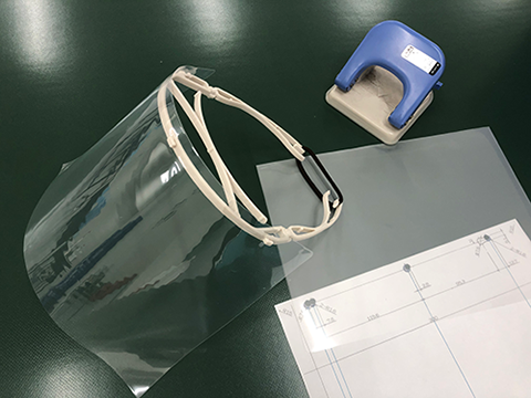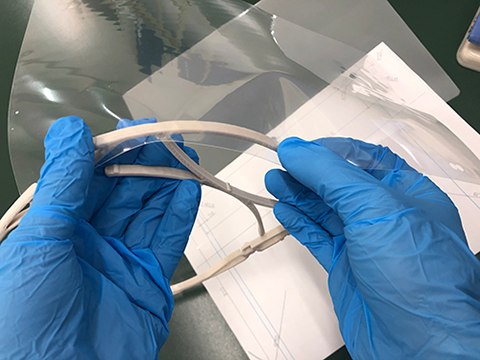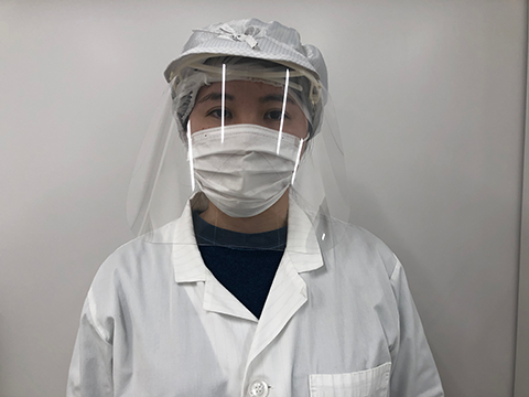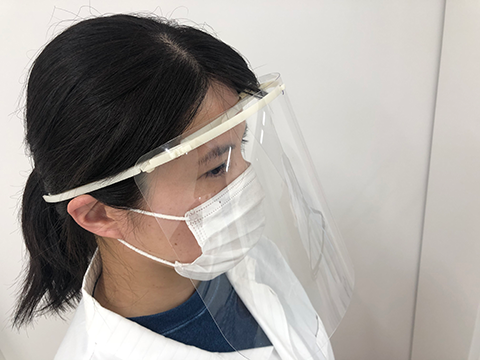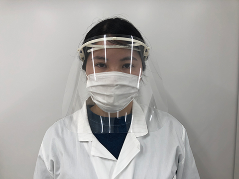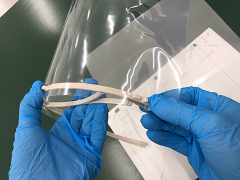 シールドが完成したら、フレームに順番に取り付けてください。取り付け順は透明シールドの穴の2カ所の距離が近い側が最後の取り付け部分です。最後はパチンと音がするまでフレーム形状に取り付けてください。