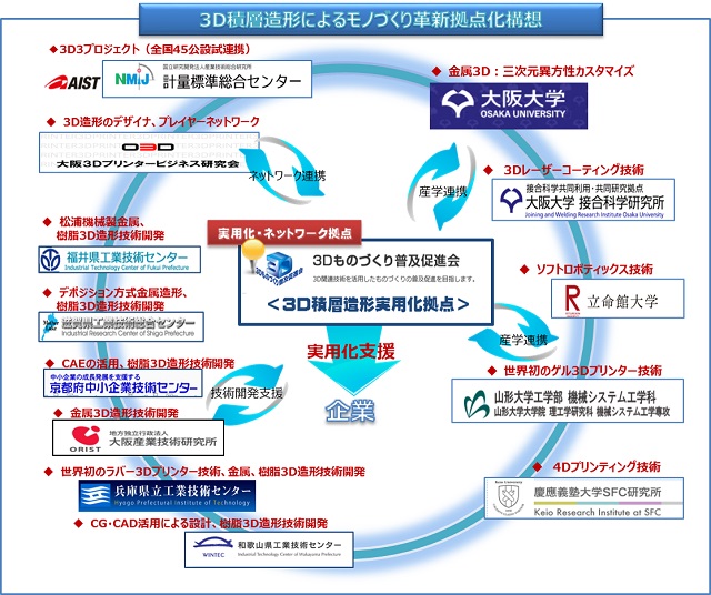 これは近畿経済産業局が主体となり、3D積層造形を活用した新たなモノづくりの普及を目指す「3Dものづくり普及促進会」(弊社丸紅情報システムズ株式会社も会員)と連携し、下図のような産学官連携による広域ネットワークを構築するものだそうです。