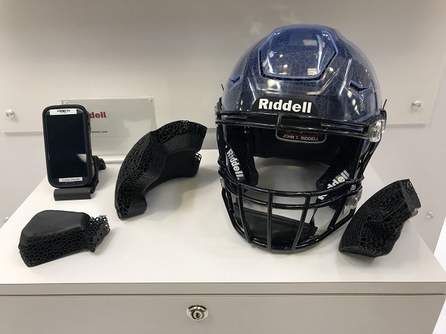 下はコンセプト部門で1位を獲得した、アメリカンフットボールのクッションを、人の頭の3Dスキャンデータから、専用開発ソフトウエアによる複雑な編み目構造を自動設計、ウレタン材料による3Dプリントによりオーダーメイドで作る仕組みを開発された実物も展示されていました。最近スポーツ用品このようなマスカスタマイゼーションを実現した商品が次々市販されるようになり、今後も増えていくことが予想されます。