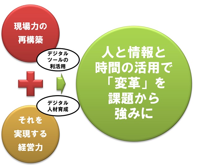 例えばこれから熟練技能者が多く退職し、若年労働人口は減り、補うために外国人労働者が増える、ロボットの活用が増えるなどこれから起こる変化にどう対応するかは、「課題」と考えがちですが、デジタルの力を使い、現場が再構築や技能継承を進めるとともに、経営側はデジタルを使いこなせる人材育成をして、現場の再構築を実現することで、「課題」を「強み」に変えるという考え方の提案があります。しかし、これらは1つの部署だけでは変革は難しく、組織横断で行うべきことなので、やはり大事なのは企業のトップがデジタルトランスフォーメーションについて理解し、変革を率先し、狙いと得られる利益を関係者と共有していくことが、海外の過去の事例でも成功のポイントになっていたようです。