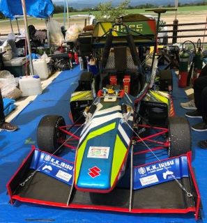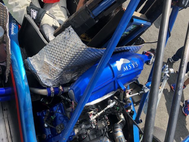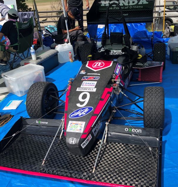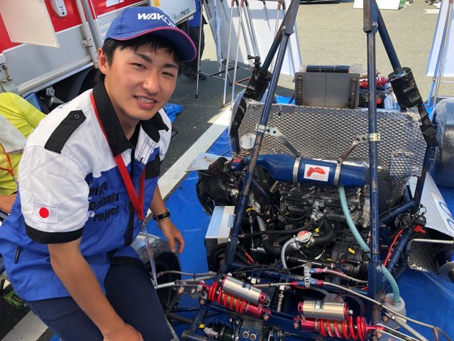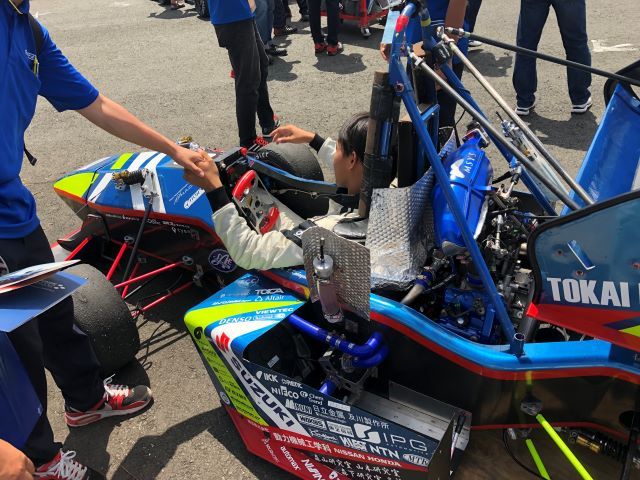 それらの部品は問題なく機能したそうです。競技で走る順番で、ちょうど雨で路面がぬれているタイミングとなってしまった(写真でもレインタイヤ)ことが残念と仰ってましたが、最後まで完走されたことを指導教官の方も「学生が本当によくやってくれた」と喜ばれていました。
