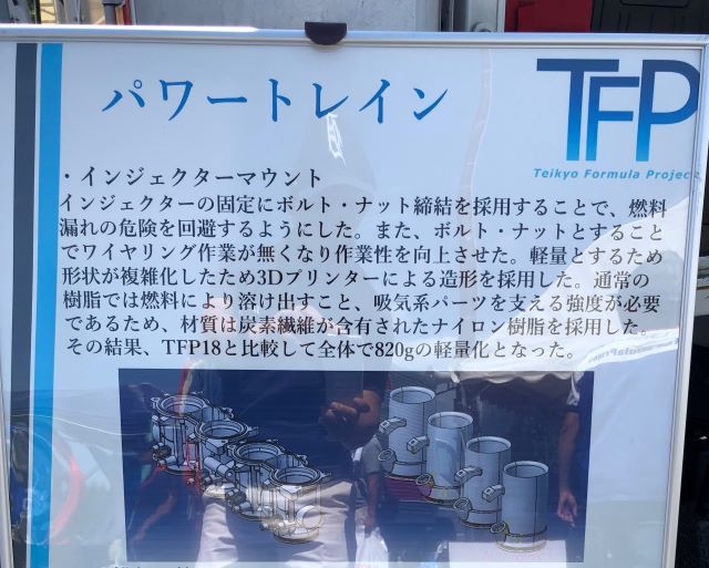 こちらは昨年はサージタンクだけでしたが、今年はブランチインジェクターパイプも採用されました。アルミからNylon12CFに変えたことの効果をピット前のパネルで示されていました。