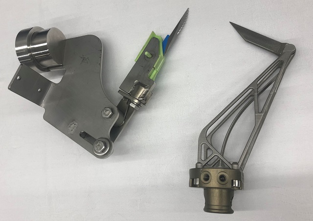 写真の左が従来の工具で、プレスや切削の金属部品をボルトナットで組み立てて作られていましたが、金属3Dプリンティングで作ることを前提に、右のようなトポロジー最適形状にしたことに加え、中央にばね(曲がって見える部品)機構も組み込み、一体化、軽量化したそうです。そこまでは他の事例でも見られるのですが、「すごいアイデアだ!」と驚いたのは、先端のナイフでした。