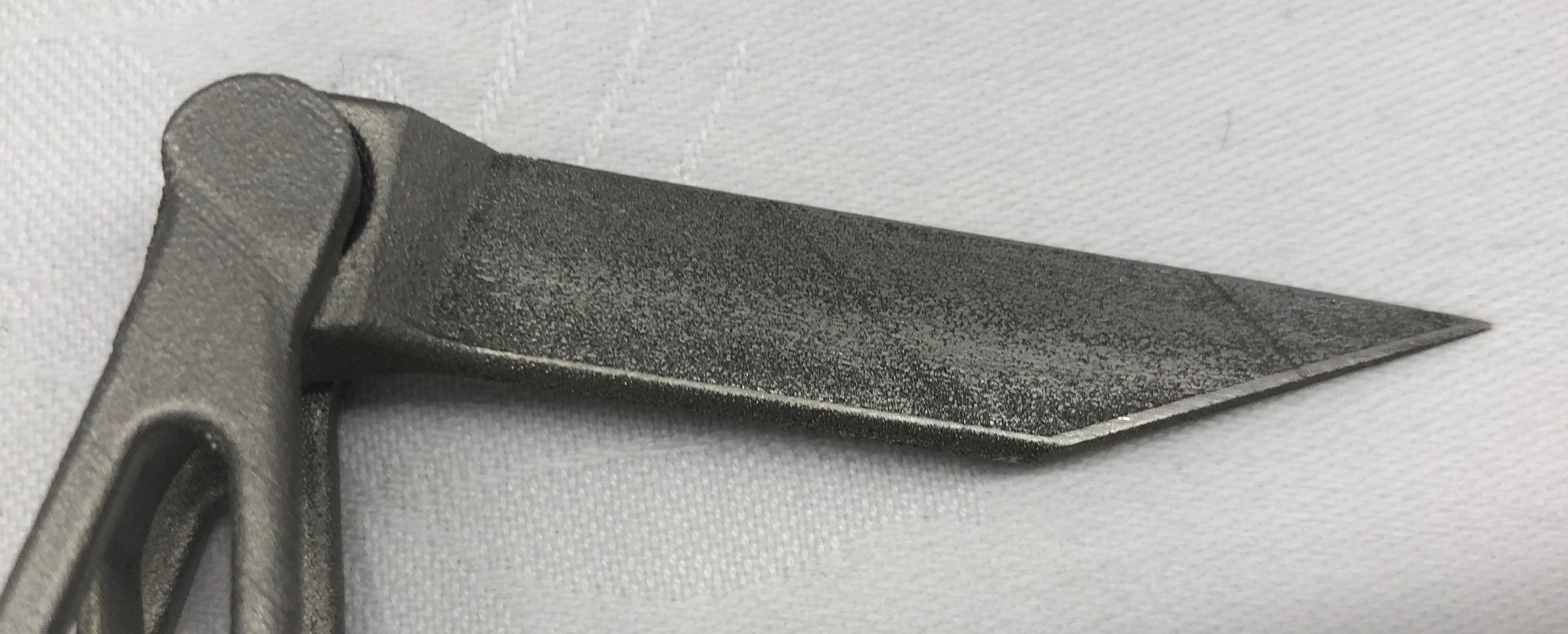 パンの生地を触ったことがある方はとても手にくっつきやすいことをご存知かと思います。同じくナイフにもくっつきやすかったそうですが、金属粉末をレーザーで焼結積層する工法では、わざと小さな通孔空洞をもつ「ポーラス」構造を作ることが出来るので、それはこれまでも金型のガス抜きに使われた例がありますが、それをナイフに使うことで刃の表面から空気を出しながら切れる構造にしたことで、くっつきにくくしたそうです。