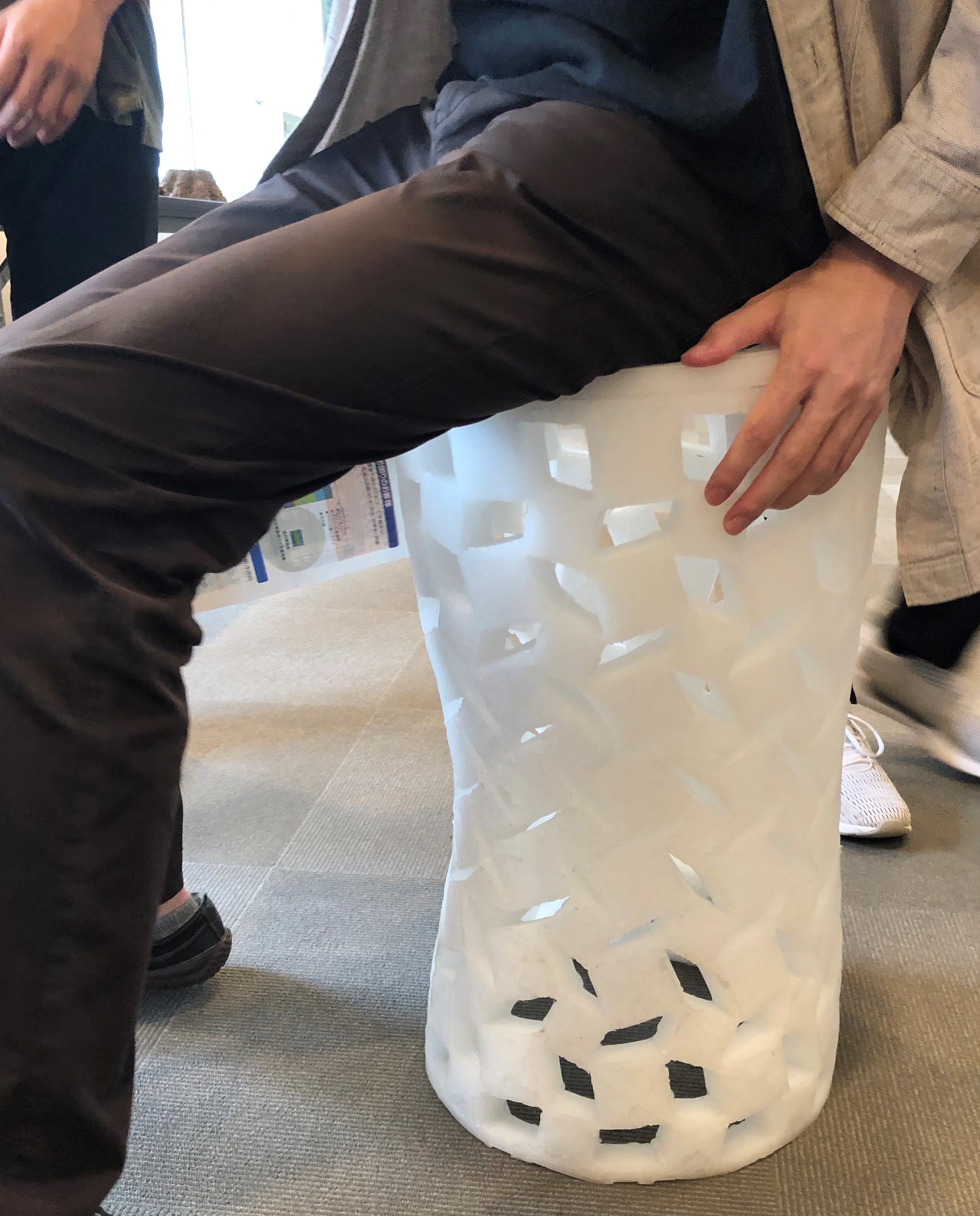 このように実際に座ることが出来るサンプルを展示されていましたが、クッション性は材料の柔らかさだけでなく、少し不規則な市松模様のような立体構造により生み出され、写真のように体重がかかると中央部がくびれるように内側に変形するよう設計されていました。これも3Dプリンティングは、このような大きさの複雑一体構造物を、切削加工や型成形が難しいエラストマーで「作る」ことは3Dの価値ですが、出来た椅子を運ぶ軽さ、座った時の気持ちよさ、加えて使い終わった後のリサイクル性も含め、「+1D」の価値が大きい例の一つでしょう。