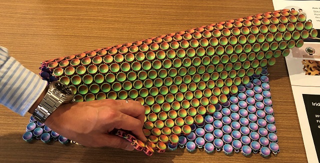 現物をご覧にならないとこのサンプルの良さや、何とも言えない不思議な「色の見え方」が伝わらないのが残念ですが、武士の鎧の鎖帷子(くさりかたびら)のように小さい円盤が鎖のような構造でつながれたもので、円盤の表裏に凹曲面があり、その曲面が複数色で着色されています。これを平面に置いてみただけでは何も起きないのですが、写真のように手で立体的に動かしたりすると凹曲面から見える角度や範囲が変わるため様々な色が変化して見えるようになります。この色彩はコンピュータで計算され設計、着色されたものですが、これも3Dプリンティングを前提とし、利点を生かすDfAMがあって出来ることで、3Dプリンターはこれを一体で立体現物化する「3D」の価値を生み出しています。加えてこれを動かすことで得られる独特の色彩や、それを見て感じる心地よさは「+1D」の価値で、3D以上に大きい価値だと思います。
