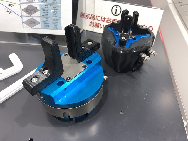 特に先端のグリッパーは人に触れてしまうことを想定し、爪の角には丸みを付け、つかむ軸に合わせた形に設計されています。また下の写真の右奥の3本爪グリッパーには、Statasys F123シリーズで造形できる軟質ポリウレタン「TPU92A」で金属部分を覆うカバーもつけられています。これはその柔軟性を利用し、着せ替え人形のように簡単に脱着することが出来るように設計されています。