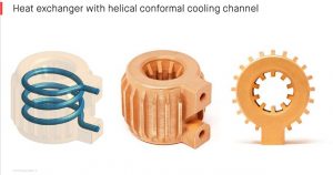 これはある装置の熱交換(冷却)部品です。部品の大きさ、必要スペースは出来る限り小さく、かつ冷却効率を上げるという「相反する課題」に対して、Studio システムのメーカー材料のひとつで、熱伝導率の高い工業用純銅(北米でテスト販売中、今後日本発売予定)を使い、かつ切削や型成形では難しい円筒内側にもフィンを増やし表面積を上げるとともに、らせん状の冷却水管を内部に設計することで改善した例です。