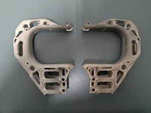 これはナッツ類やオリーブの枝を振動させ、実を傷つけずに効率よく落として収穫するための、人が肩に下げて使う農機具の先端部品です。振幅62mm、毎分2000回の振動を枝に伝える部品ですが、既存のアルミ製部品に対し、強度は上げ、重量は増やさないという「相反する課題」改善のため、コンピュータシミュレーションによる最適形状を設計し、これを製造するためにDesktop Metal Studio システムで作り、実験実証(以下動画 音あり)したそうです。