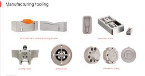 樹脂射出成形型部品(3次元冷却水管)、金属ダイキャスト型部品、コイニング加工治具、押出成形ダイ、プレス刻印ダイ など