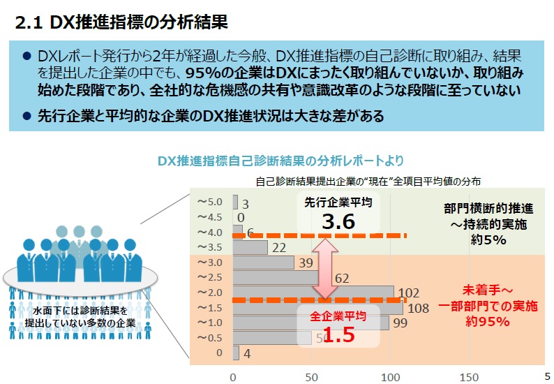 これが高いか低いか一概には言えませんが、日本は労働生産性1位だった2000年から2018年までで約16%の増加ですが、デンマークは約140%の増加で、10位から3位に上がっています。これは国家戦略として情報通信技術など知識集約型産業を政策的にサポートしていることも一因だそうです。昨年も多く聞かれたデジタルトランスフォーメーション(DX)の導入活用も労働生産性向上に有効と言われています。それについて日本の実情と課題について参考になる資料が昨年末12月28日に経済産業省から下記の通り公表されました。