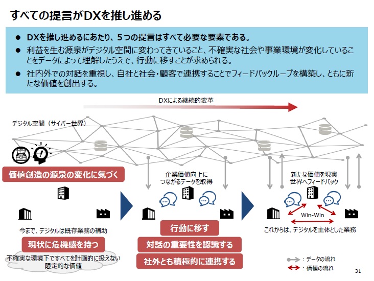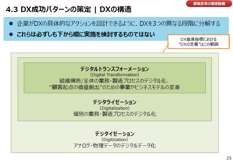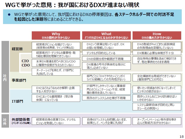 この資料を見て感じたことは、DXと3Dプリンティングはとても似ていて、この資料の「DX」を「3Dプリンティング」に置き換えて読むと3Dプリンティングの現状と課題が見えるのではということでした。例として資料の一部を以下に引用します(画像クリックで拡大してご覧いただけます。)