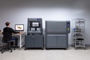これはこれまで販売してきたStudioシステムのモデルチェンジ版と言えるもので、従来は①プリンターによる積層造形→②デバインダーによる液体溶媒脱脂→③ファーネスによる焼結、つまり3つの装置による3つのステップだけでしたが、Studioシステム2では、新開発のバインダー材料により、①プリンターによる積層造形→②ファーネスによる加熱脱脂+焼結、つまり2つの装置による2つのステップでも出来るようになりました。使い方は下記動画をご覧ください(英語のみ、1分15秒)。