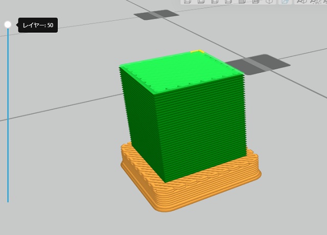 これも要素が複雑に関係するので短く説明することは難しいのですが、例としてStratasys FDM Fシリーズの場合で説明します。まA:10×10×10mmの立方体を設計し、プリソフトウエアのGrabcadPrintで開いて積層厚さ0.254mmを選んでスライスデータを作ると下の画像のようになります。
