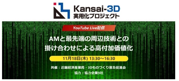先日2021年11月18日に、経済産業省近畿経済産業局「3D積層造形によるモノづくり革新拠点化構想(Kansai-3D実用化プロジェクト)」のオンラインセミナー「AMと最先端の周辺技術との掛け合わせによる高付加価値化」が開催され、筆者も参加しました。終了していますが下記画像クリックで概要をご覧いただけます。