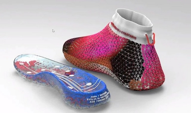 そのような「小さな変化」になるかもしれない展示の例をご紹介します。未来のファッションを研究する複数のデザイナーによる欧州のプロジェクト Re-FRAMEをStratasys社がPoly Jetフルカラープリンターと、人の骨、軟組織、血管などのリアリスティックな模型のために開発した硬質・軟質材料による支援でできたEvolveとSepiidaというシューズは、歩く人の足の変形、温度、圧力や摩擦などをデータで記録でき、次のデザインの改良に活かせるとのことです。