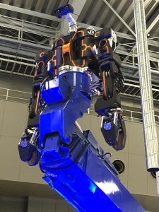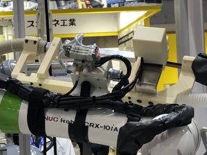 また、以前より公開されているストラタシスジャパン様の活用事例で見たことのあった株式会社人機一体様のロボットもようやく実物を見ることが出来、その大きさを実感できました。肩腕の黒いカバーの部品はStratasys FortusとNylon12CF材料で作られています。これは鉄道の架線など高いところの工事、塗装、点検などを人が上ることなく、地上で操作するものだそうです。