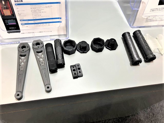 特に今回は新発売となるStratasys OriginOneの特長をお伝えするためのサンプルを展示しました。樹脂は光硬化性で、平滑面やシボなどのテクスチャーを含め、射出成形に近い表面品質と形状で、射出成形エンプラ、エラストマーに近い物性、耐久性を持った