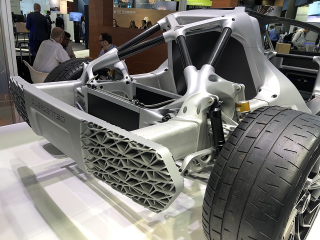 実は筆者は2018年にドイツでの展示会formnextで下の写真の通り試作車のフレームを実際に見て驚いたと同時に、「これが本当に市販されるのか?何年先か?」と正直思っていました。