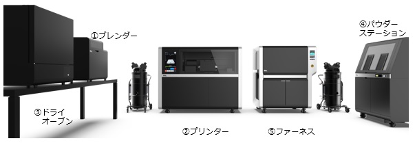 Desktop Metal Shopシステムは下の写真の通り、金属粉末バインダージェッティング方式の3Dプリンターと、製造工程に必要な装置一式すべてがパッケージになった製品です。