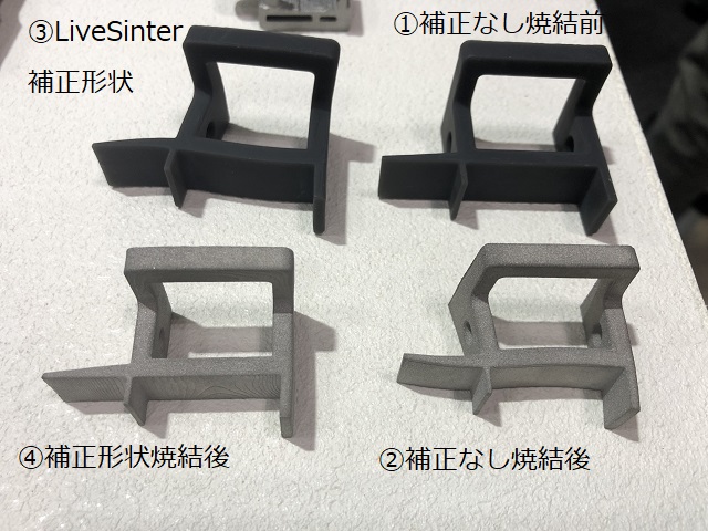 また、Desktop Metal社が開発した、金属バインダージェッティングの焼結現象シミュレーションから、焼結時の自重や形状による収縮異方歪みを予め補正し、焼結品の形状寸法品質を高めるソフトウエア「Live Sinter」の使用前後サンプルも初めて展示しました。下の写真の通り、補正せずに焼結した後の②の形状は直線部が曲がって見えますが、Live Sinterで補正した形状を焼結した④は直線に出来ていることがわかります。