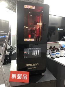 その他、Stratasys の新しい紫外線硬化樹脂DLP方式「P3テクノロジー」による3DプリンターOrigin Oneも初めて会場で造形実演展示をしました。